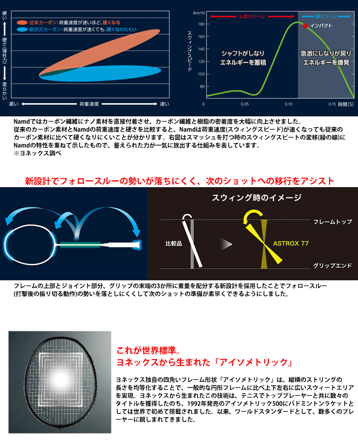 【強打を中心に展開する攻撃力重視のプレーヤーに】 ASTROX77は、カーボン繊維自体にナノ素材を直接付着させカーボン繊維と樹脂の密着度を大幅に向上させた 新次元のカーボン素材Namdをシャフト部分に世界初採用。